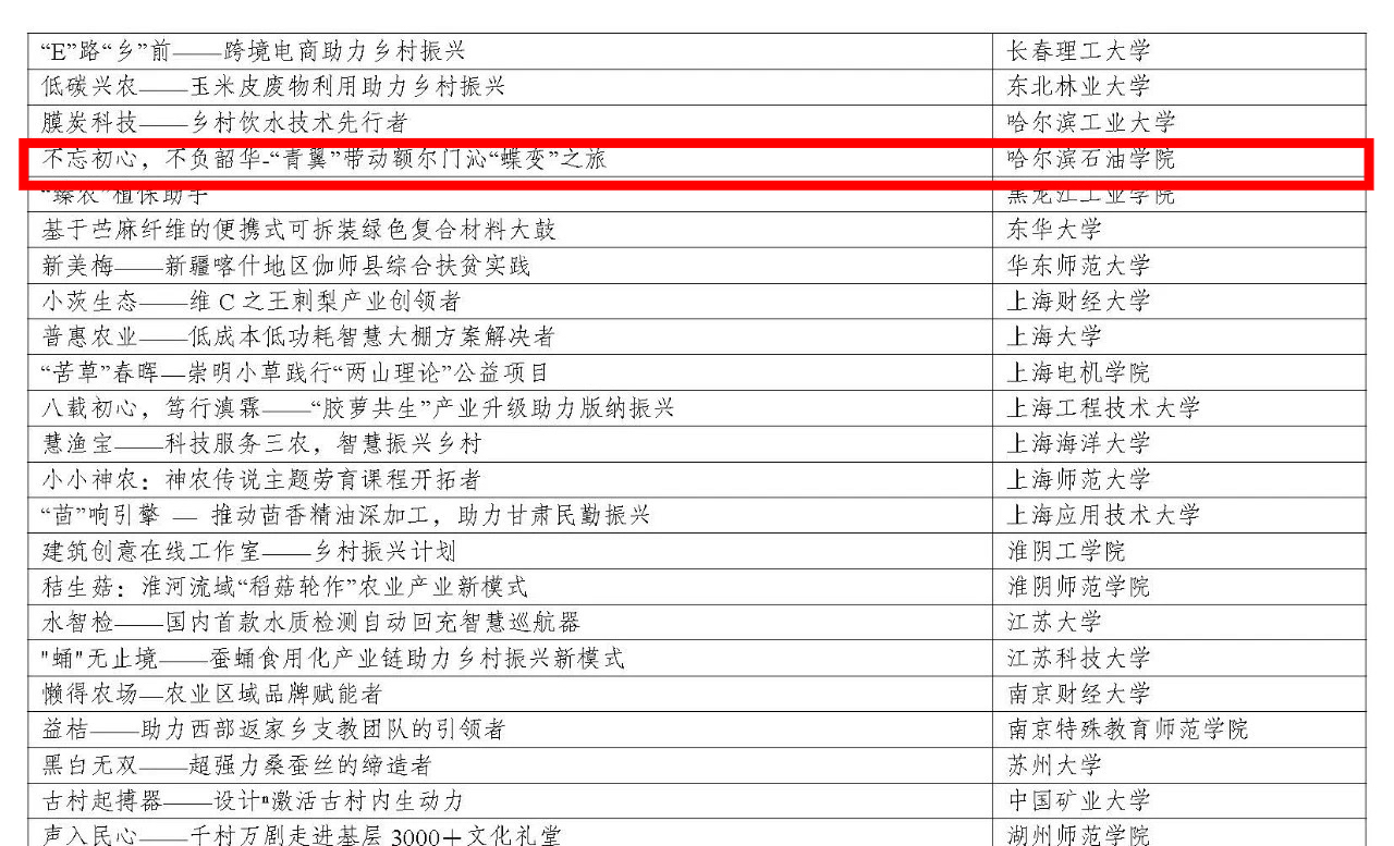 马克思主义学院教师王俊彦带领学生深入开展社会实践,围绕乡村振兴和农业农村现代化建设主题,结合思政课理论知识,开展调查研究。经过前期大量的调研积累,王俊彦老师指导学生团队策划推进了特色乡村振兴创新创业项目《不忘初心,不负韶华—“青翼”带动额尔门沁“蝶变”之旅》。随着该项目的推动和实施,宣传推广了达斡尔族文化,并通过开发特色旅游带动当地经济发展。该项目在第十三届工银融e联“挑战杯”黑龙江省大学生创业计划竞赛中荣获金奖,并入围国赛。该项目经过全国463个项目的激烈角逐,最终经评审委员会评选,荣获第十三届“挑战杯”中国大学生创业计划竞赛铜奖。