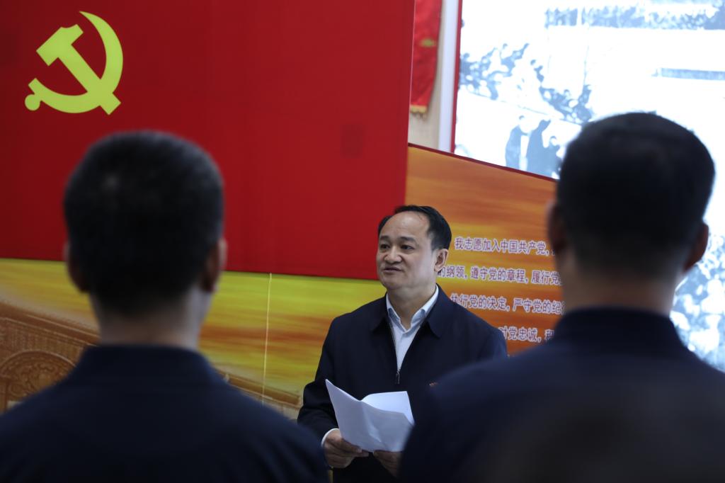 在纪念馆宣誓厅,全体党员肃立在鲜红的党旗前,庄重地举起右拳,重温入党誓词,坚定有力的誓言表达出党员们感悟思想伟力、牢记初心使命的信念和决心。