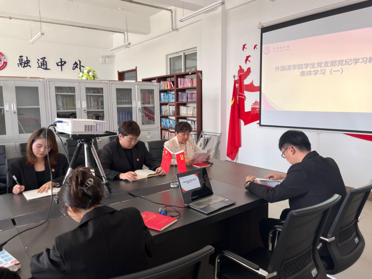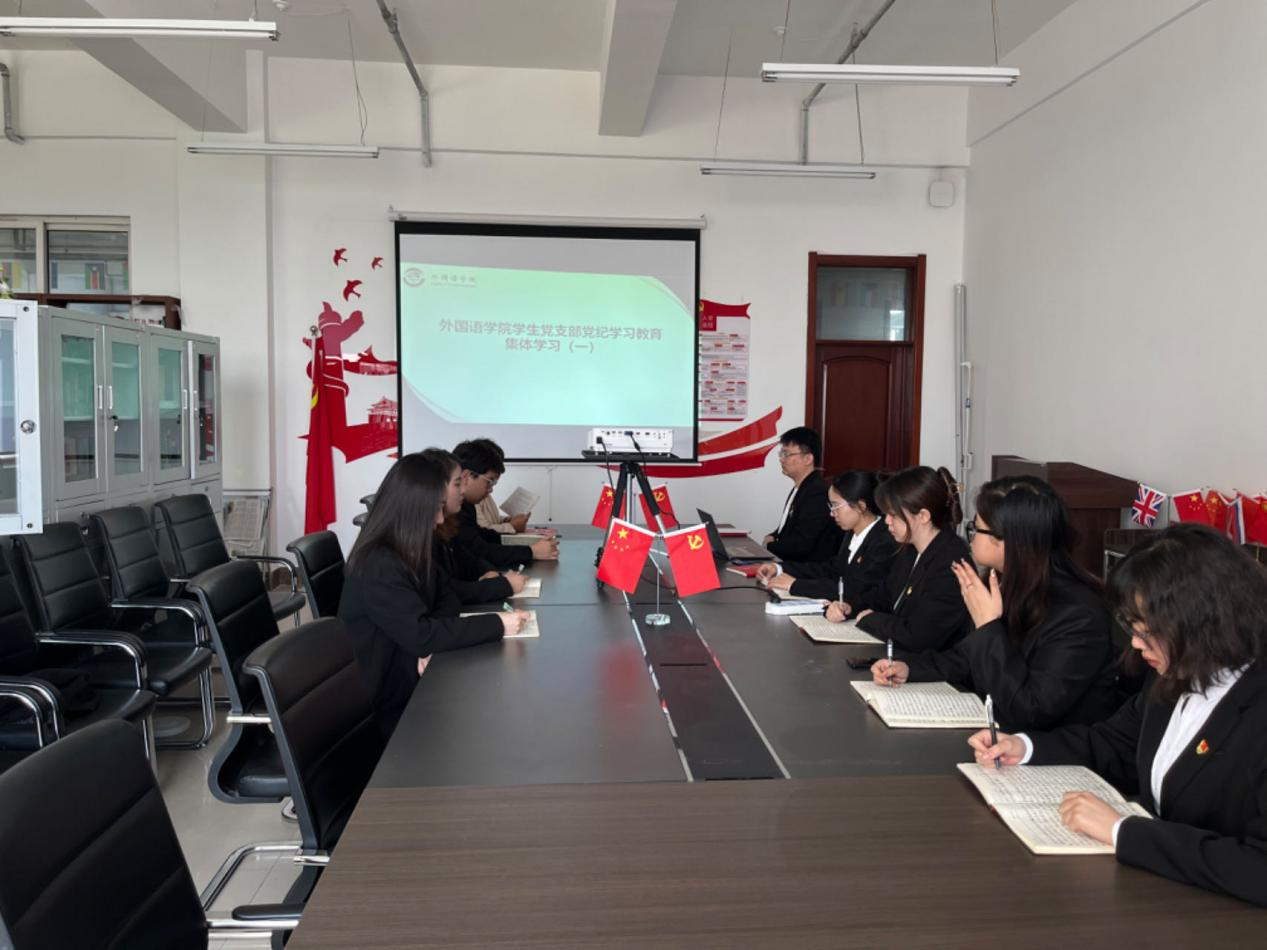 为深入学习贯彻习近平总书记关于党纪学习教育的重要讲话和重要指示精神,认真学习贯彻《中国共产党纪律处分条例》(以下简称为条例),按照外国语学院党总支工作部署,2024年4月25日,外国语学院学生党支部在主教706党员会议室组织学生党员进行集中学习。学生党支部书记赵连琦主持会议并讲话,宣传委员郑智慧、党支部党员参加。